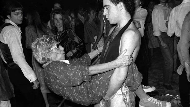 Part of the lure of a nightclub like Studio 54 is that you went home with plenty of stories to tell about the wacky things you saw go down inside. Here we see one of those notable moments where an elderly woman is dancing with a young man.